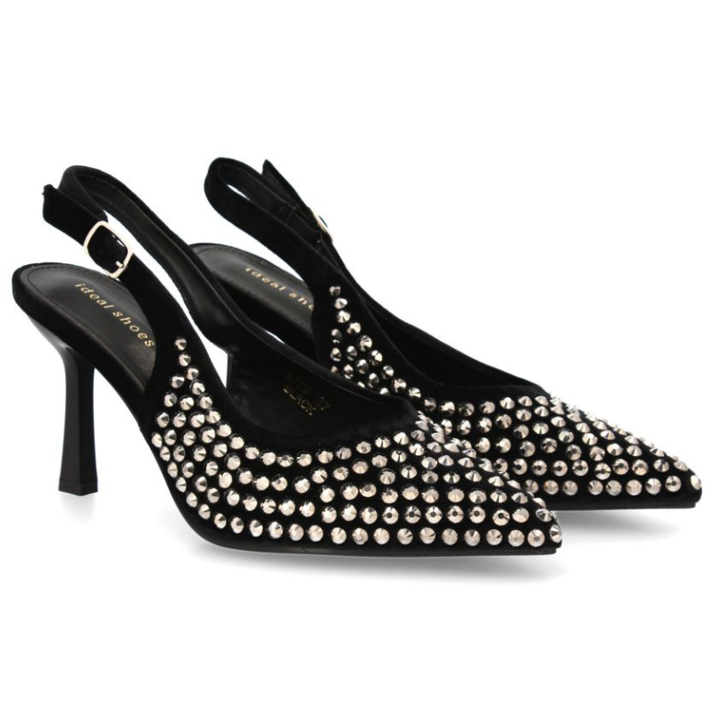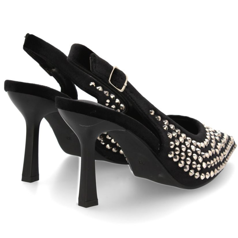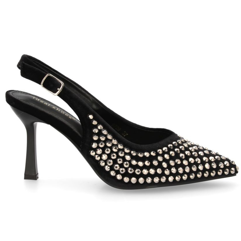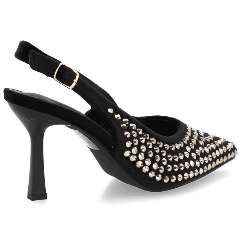 ZAPATO STILETTO DESTALONADO CON CIERRE DE HEBILLA Y PEDRERIA. TACON FINO DE 8CM.