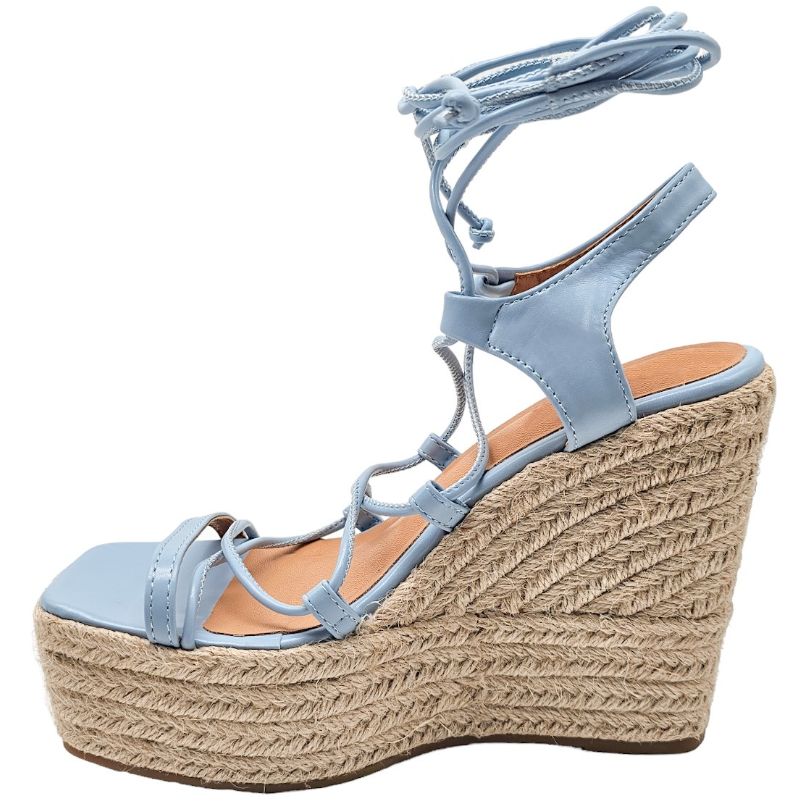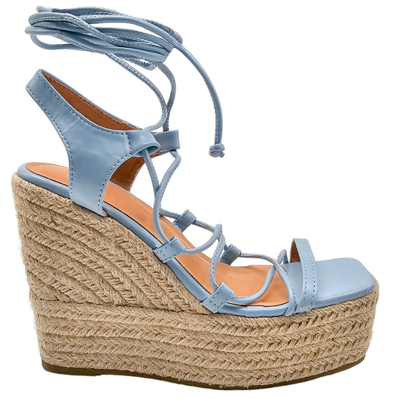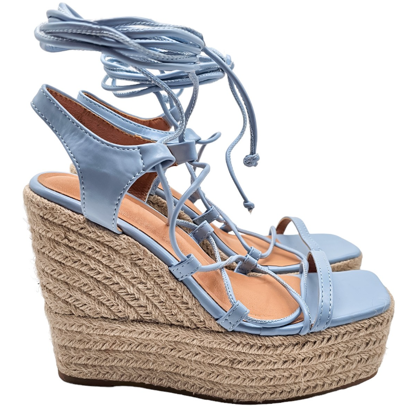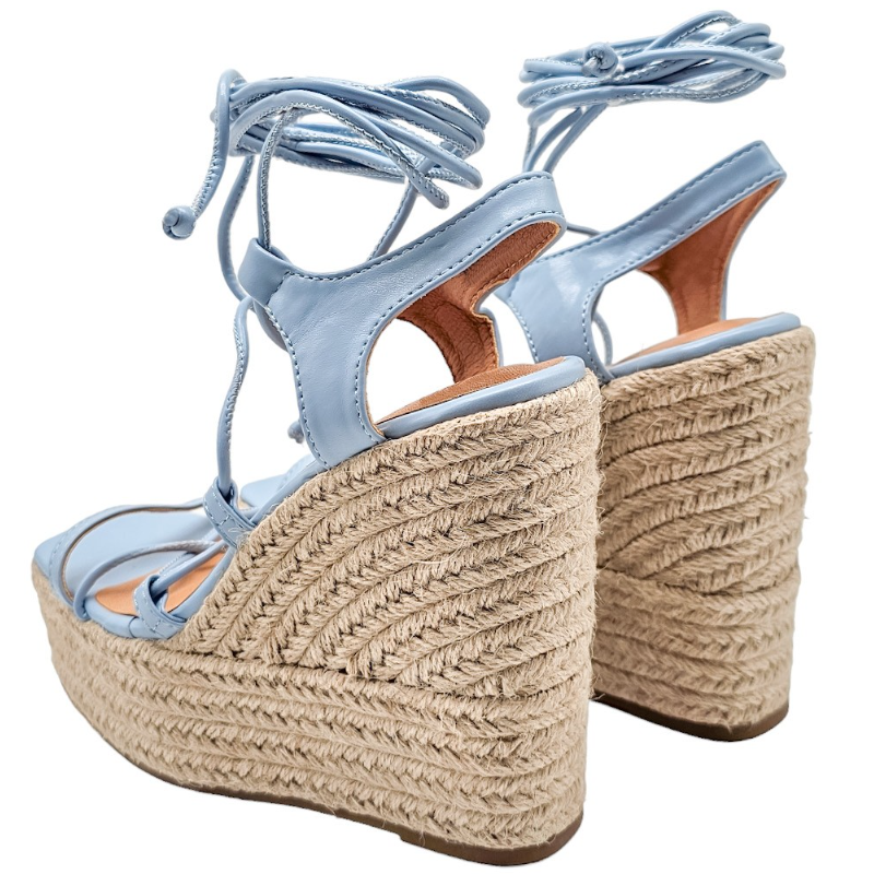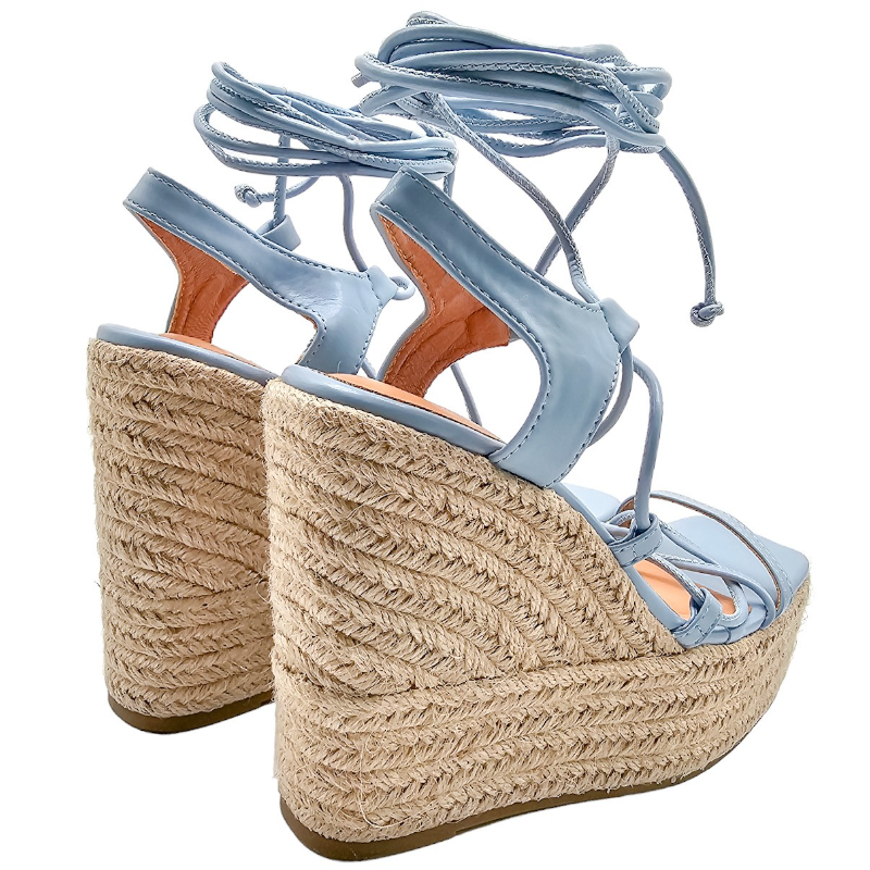 SANDALIA DE ESPARTO MULTITIRAS DE PIEL SINTÉTICA CON TACON 12 CM Y PLATAFORMA DELANTERA DE 4,5 CM CON TIRAS PARA ANUDAR A LA PIERNA.