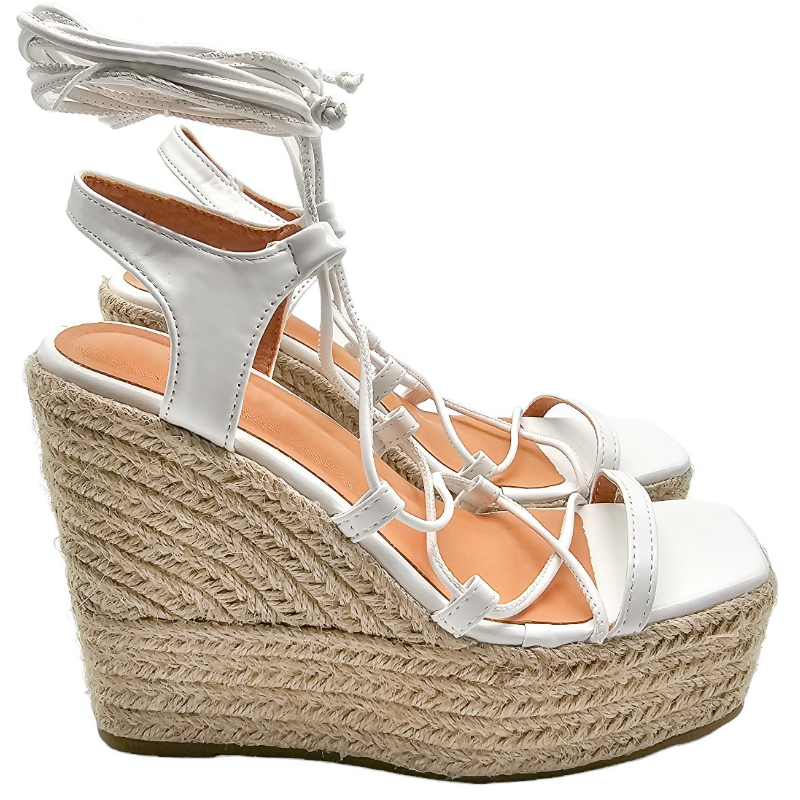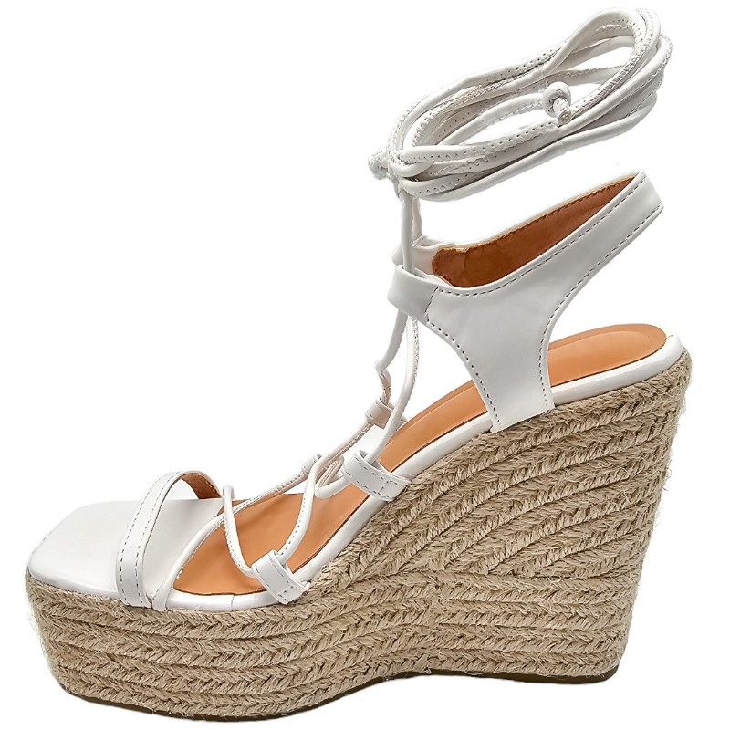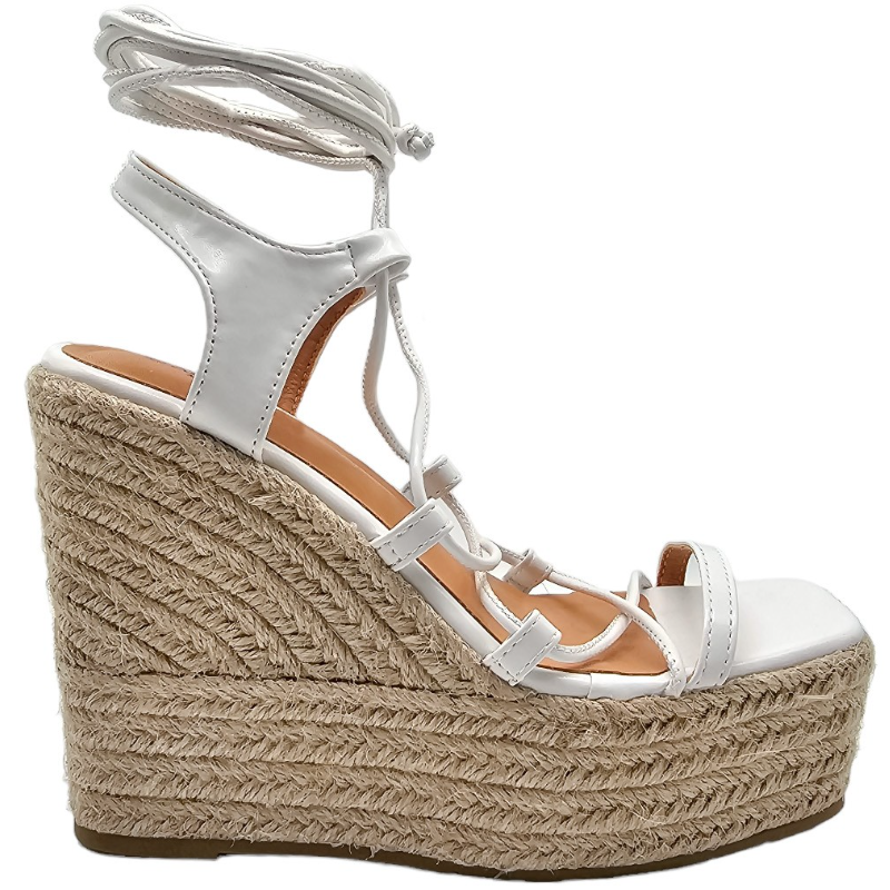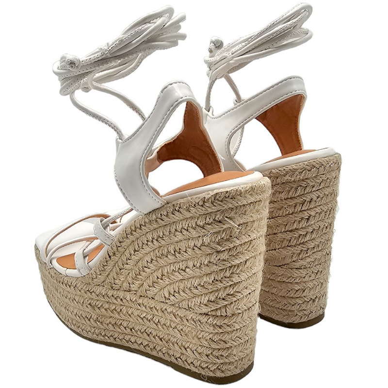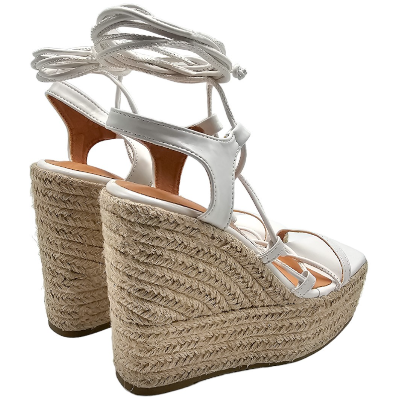 SANDALIA DE ESPARTO MULTITIRAS DE PIEL SINTÉTICA CON TACON 12 CM Y PLATAFORMA DELANTERA DE 4,5 CM CON TIRAS PARA ANUDAR A LA PIERNA.
